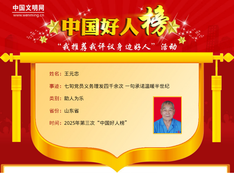 王元忠,男,1947年7月生,中共黨員,山東省臨沂市沂南縣青駝鎮玉戴河村村民。一把剪刀、一把梳子、一個推子、一壺熱水,再加上幾條毛巾,是王元忠最珍視的“戰友”。42年來,他用這套最簡單的工具,為村民義務理發四千余次,彰顯了一個共產黨員最質樸的初心與擔當。