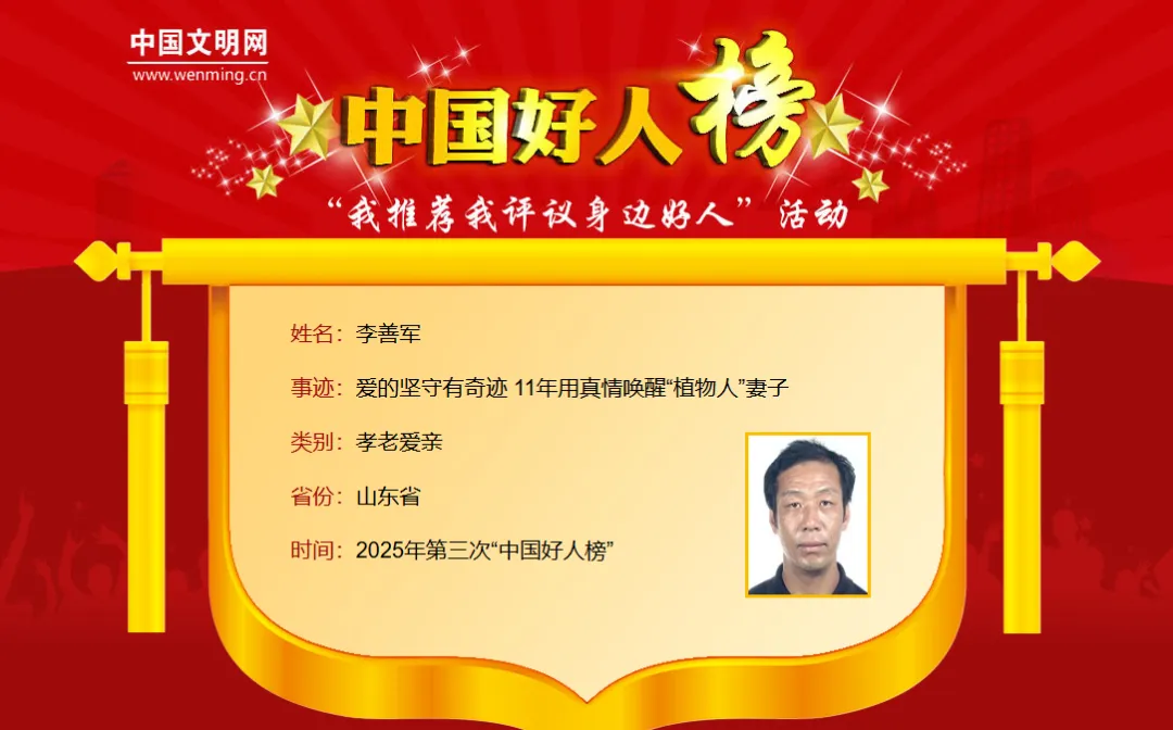 李善軍,男,1965年11月生,中共黨員,山東省濟寧市微山縣兩城鎮東單村村民。2014年3月27日,李善軍的妻子因意外不幸成為植物人,為喚醒“沉睡”的妻子,3000多個日日夜夜,他堅持每天為妻子翻身、喂飯、清洗、按摩……他把對妻子的愛藏在每一個照顧的細節里,用自己愛的堅守創造了奇跡。